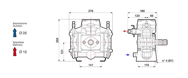 Частини в контакті з рідиною виготовлені з анодованого алюмінію, стійкі до дії хімічних речовин, що використовуються в сільському господарстві Конфігурація з 2 мембранами, з акумулятором тиску Напірне з'єднання з гаком для прямого з'єднання з насосом шланга або вузла управління.