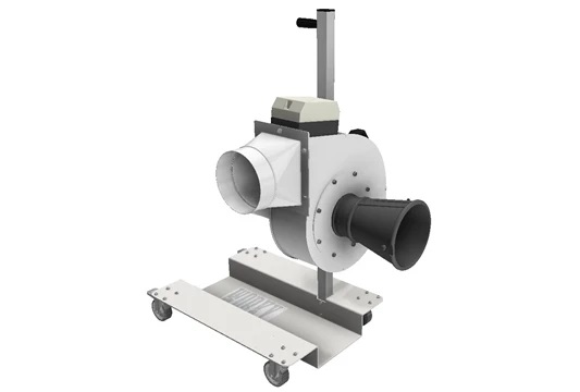 Мобільний вентилятор для відведення вихлопних газів з регульованим по висоті двигуном потужністю 0,75 кВт та вбудованим вимикачем запуску/зупинки.