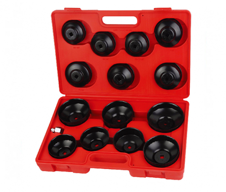 Набір знімачів масляних фільтрів складаеться із 14 предметів, призначений для використання на станціях технічного обслуговування автомоблів.Знімач для зняття масляних фільтрів у вигляді "чашок" знижує ймовірність пошкоджень корпусу масляного фільтра при установці його на двигун автомобіля. Чашки покриті спеціальним захисним шаром із оксиду, для захисту від корозії.