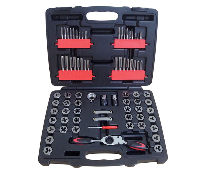 Мітчики М3х0,5; 3х0,6; 4х0,7; 4х0,75; 5х0,8; 5х0,9; 6х1; 7х1; 8х1,25; 9х1; 9х1,25; 10х1,25; 10х1,5; 11х1,5; 12х1,5; 12х1,75.1/8х27; 1/8х28; 4х40; 6х32; 8х32; 10х24; 10х32; 12х24; 1/4х20; 1/4х28; 5/16х18; 5/16х24; 3/8х16; 3/8х24; 7/16х14; 7/16х20; 1/2х13; 1/2х20.Плашки 1/8х28; М3х0,5; 3х0,6; 4х0,7; 4х0,75; 5х0,8; 5х0,9; 6х1; 7х1; 8х1,25; 9х1; 9х1,25; 10х1,25; 10х1,5; 11х1,5; 12х1,5; 12х1,75.1/8х27; 1/8х28; 4х40; 6х32; 8х32; 10х24; 10х32; 12х24; 1/4х20; 1/4х28; 5/16х18; 5/16х24; 3/8х16; 3/8х24; 7/16х14; 7/16х20; 1/2х13; 1/2х20.Плашкотримач 1 шт. Тримач для мітчиків 2 шт. Тріскачка спеціальна для плашкотримача Мікровикрутка шліц 1 шт. Набір різьбових шаблонів метричних 1 шт. Набір різьбових шаблонів дюймових 1 шт.