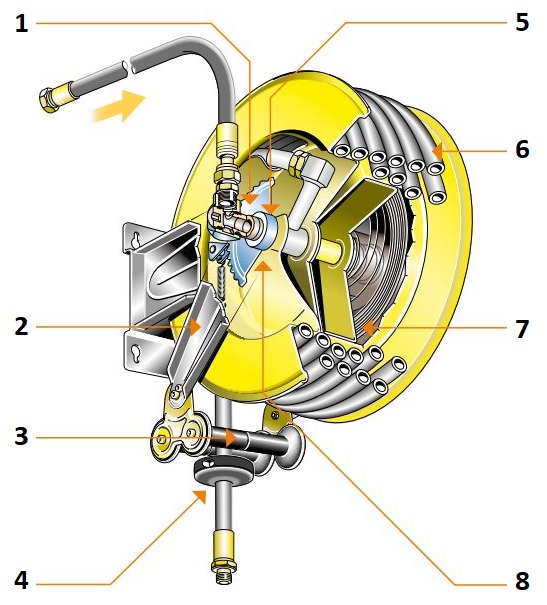 1. Автоматична система блокування: дозволяє зафіксувати шланг на потрібній довжині 2. Регульований важіль: для витягування шланга відповідно від монтажу котушки 3. Самозмащувальні направляючі ролики шланга: широкий багатосторонній отвір 4. Регульований обмежувач шланга 5. Опорні втулки котушки з латунного сплаву, які самозмащуються, ефективні та стійкі до корозії 6. Барабан котушок міцний і практичний з ребрами та закругленими краями 7. Повністю закрита і захищена автоматична поворотна пружина постійного зусилля 8. Поворотне з’єднання каналу рідини з латуні та з ущільнювачами Viton® |