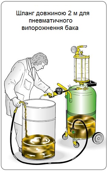 Стандартна пневматична установка для відкачки відпрацьованої оливи з автомобіля. Відкачка відпрацьованої оливи проводиться шляхом відсмоктування за допомогою щупів, що додаються в стандартній комплектації. Після створення вакууму в установці вона працюють самостійно, немає необхідності в постійному підключенні до мережі стисненого повітря.