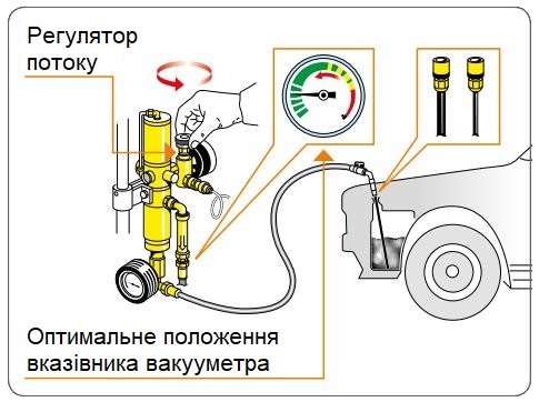 Регулювання швидкості роботи виконується за допомогою регулятора потоку, змінюючи подачу повітря на вході. Переконайтеся, що вказівник вакууметра завжди знаходиться в оптимальному положенні.