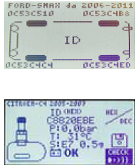 Вимірює тиск в шинах, ідентифікаційний номер, температуру і заряд батареї (3 ступені) датчика тиску.