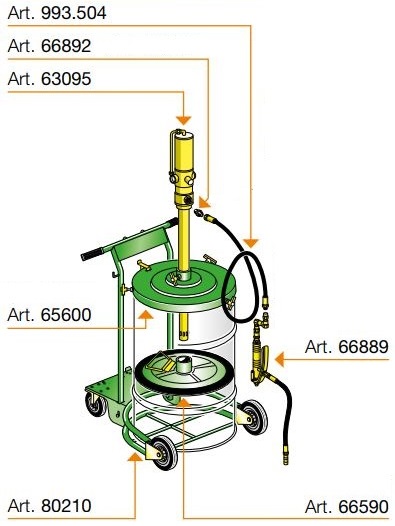 Ідеальна комбінація для подачі (заправки) консистентного мастила в будь-яких робочих умовах. Дуже зручний візок оснащений пристосуванням для закріплення бочки (180-220 кг), регульованою бічною опорою для закріплення додаткових пристроїв, колесом з гальмом.