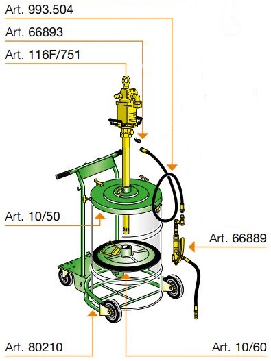 Ідеальна комбінація для подачі (заправки) консистентного мастила в будь-яких робочих умовах. Дуже зручний візок оснащений пристосуванням для закріплення бочки (180-220 кг), регульованою бічною опорою для закріплення додаткових пристроїв, колесом з гальмом.