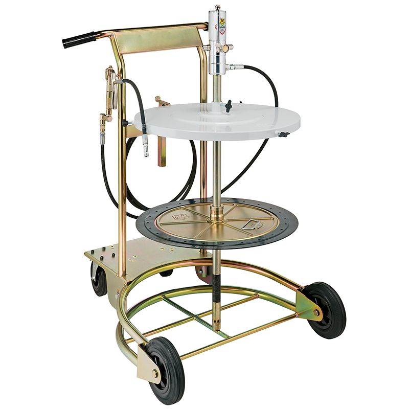 Ідеальна комбінація для подачі (заправки) консистентного мастила в будь-яких робочих умовах. Дуже зручний візок оснащений пристосуванням для закріплення бочки (180-220 кг), регульованою бічною опорою для закріплення додаткових пристроїв, колесом з гальмом.