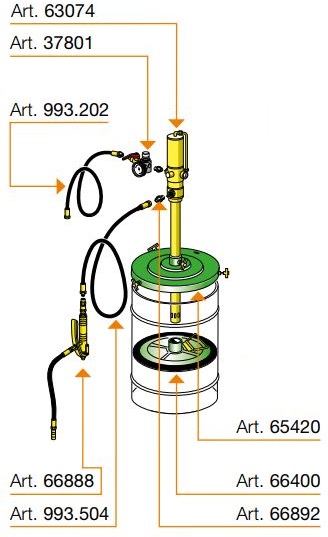 Портативний мастильний комплект для бочок із внутрішнім діаметром від 370 до 420 мм (50-60 кг), насосом R 65:1, діафрагмою, мастильним пістолетом і з’єднувальним шлангом до повітряної системи та регулятором тиску повітря.
