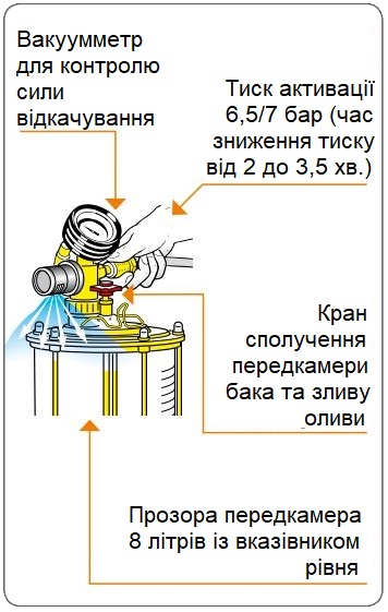 Стандартна пневматична установка для відкачки відпрацьованої оливи з автомобіля. Відкачка відпрацьованої оливи проводиться шляхом відсмоктування за допомогою щупів, що додаються в стандартній комплектації. Після створення вакууму в установці вона працюють самостійно, немає необхідності в постійному підключенні до мережі стисненого повітря. Прозора передкамера дозволяє контролювати кількість відкачаної оливи.