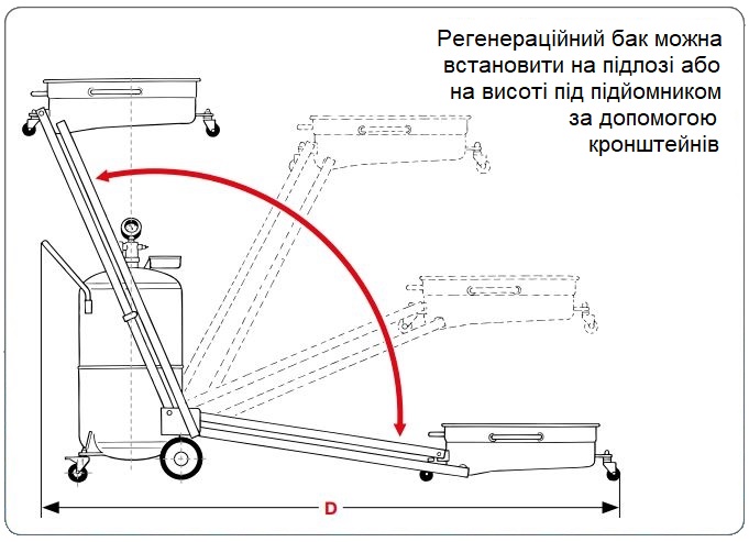 Мобільна установка для зливу відпрацьованої оливи з підкатною ванною (пантографом) на 14 літрів. Регенерація відпрацьованої оливи відбувається гравітаційним методом за допомогою підкатної ванни, встановленої на підлозі, або піднятої, якщо автомобіль або мотоцикл встановлені на підйомнику або над ямою.