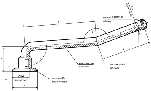 (ETRTO No: V3.04.10; A: 23,5 мм; B: 47 мм; C: 53 мм; a°90; b°154; максимальний тиск: <10,5 бар;)